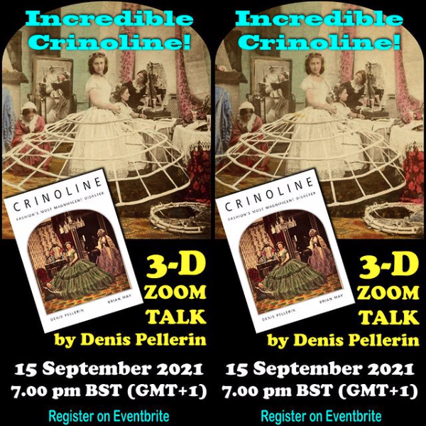 Photo historian Denis Pellerin, from the Brian May Archive of Stereoscopy, will discuss the advent of the Crinoline Cage, the relative freedom and feeling of safety it gave women, the mockery it generated in men for over a decade, the multiple cartoons and stereoscopic cards that made fun of it, but also the high penalty thousands of women had to pay, victims of an outrageous and tragic fashion which was praised by some but judged indecent by others. Denis is described as “Probably the foremost Stereo Photography historian in the world right now” (quote from Dr. Brian May, 2021).