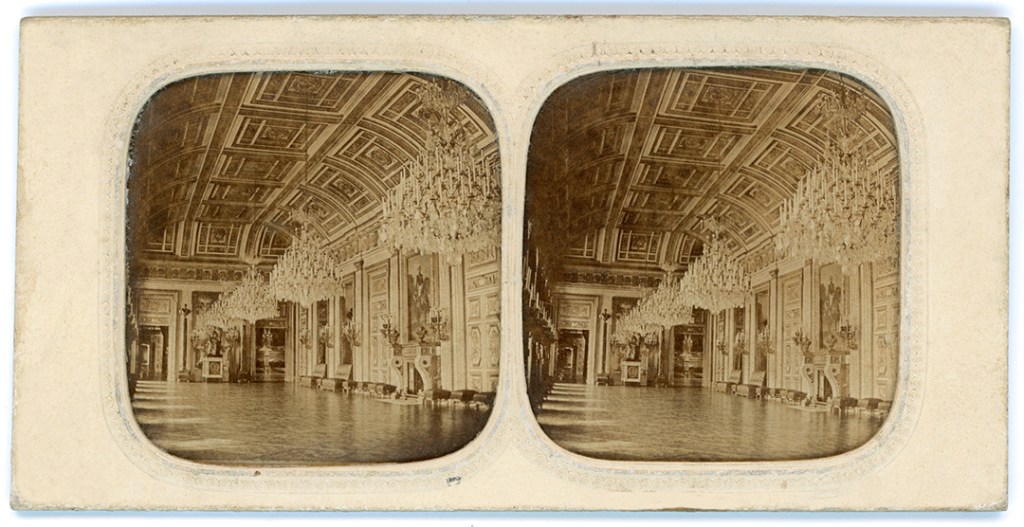 Illustration 1-The stereo card that hooked me on stereoscopy for life, showing the Salon de la Paix at the Tuileries Palace, Paris, France. Author’s collection.