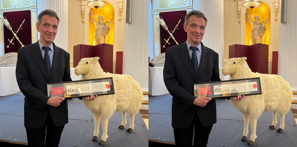 As an ancient tradition of the City of London dating back to around 1237, you will be glad to know that Denis, as a Freeman (or specifically for today, to be addressed as a ‘Youngest Freeman’), is allowed to drive a herd of sheep across London Bridge without paying a toll (but now only at a specially organised event to ensure everyone and their sheep are safe), the right to be hanged with a silk rope, to openly carry an unsheathed sword in the City, and to be drunk and disorderly without fear of arrest.