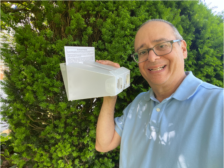 I decided to start by using a stereoscope that was created for the project “Hidden Depths” showcasing stereoimages by Jacques Henri Lartigue. What drew me to it was its box-like Brewster stereoscope design made of translucent plastic. I felt confident that its shape and light weight would make it easier for this population to hold and to view through. Its high quality prismatic lenses would optimize the viewing experience. However, it requires cards with non-standard dimensions (6 inches by 6 inches) preventing the use of standard sized stereocards (3.5 inches by 7 inches).